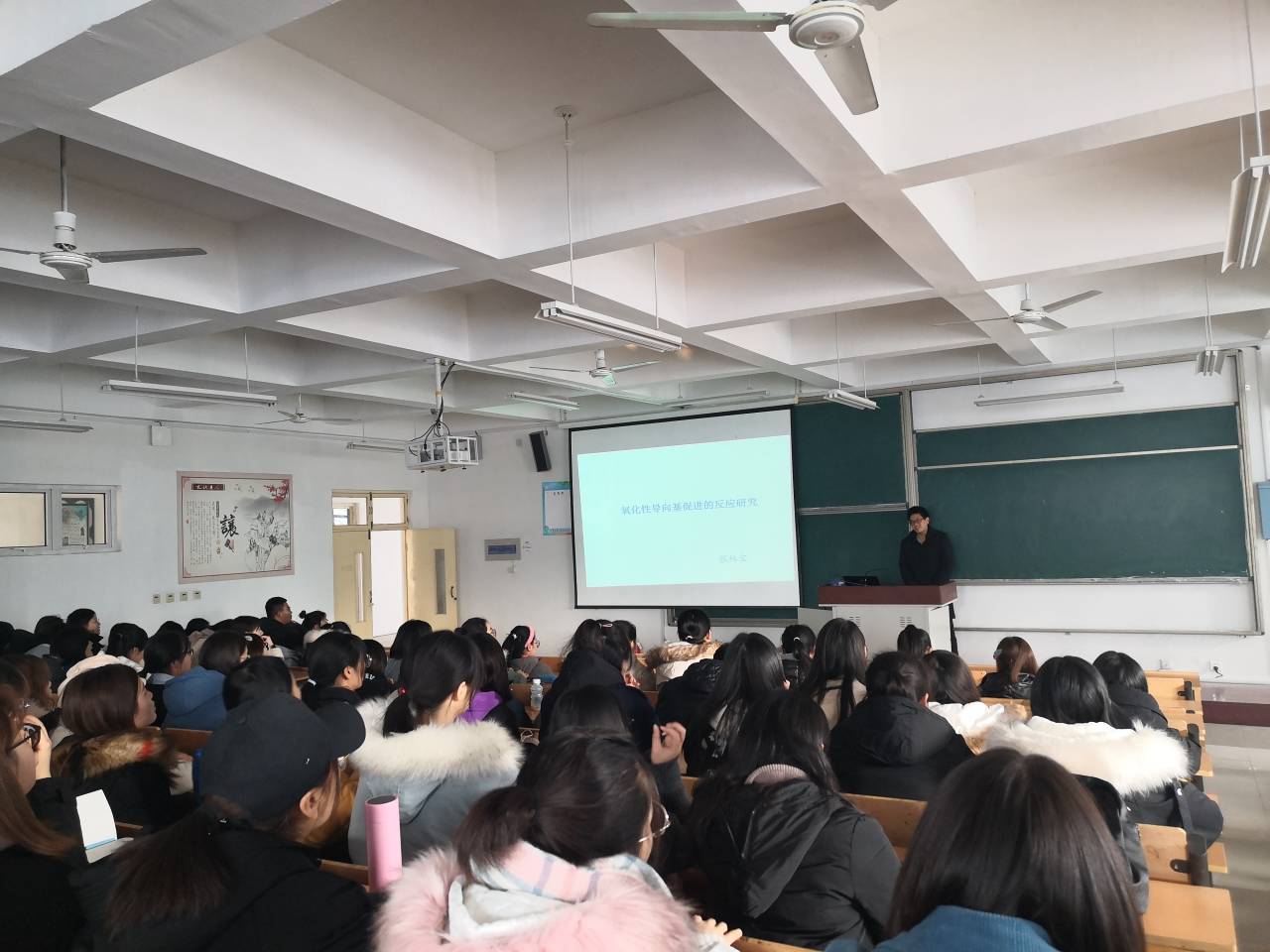 接着由张林宝博士就他的研究成果展开报告。张林宝博士对他研究的反应和反应是如何发生的做了论述,张博士提出在国内外单质的发展非常迅速,随着越来越多论文的发表,继而引发了新的思考,在单质的基础上,再加一个转化基因,这种效应是否会进一步增强呢?于是张博士基于这一策略,设计了一个论文:各种各样的转化基团,只要加一个金属,这一分子就能够被构建起来,这一反应相对发展也很快。国内外化学家各自发展了不同的转化基因,张博士和他的团队发展了氨基醇的氮盐,从中发现这种氮氧类的转化基团发展趋势是从贵的金属慢慢过渡到日常用的金属,发生反应的类型也是非常非常多的,如烷基化反应、环化反应等,这一反应非常高效有用,在医药中得到了普遍应用。随着更深入的研究得出一个启示,这个反应并不是经过一个完氧机自由基的离子团,而是自由基内六氟乙水基位次的反应历程,这是学术上的首次发现。最后,张博士提出,本科阶段要打好基础,为以后读研读博做准备,另外,讲到做研究要持之以恒,中间不能有间断,最后才能有大的突破。