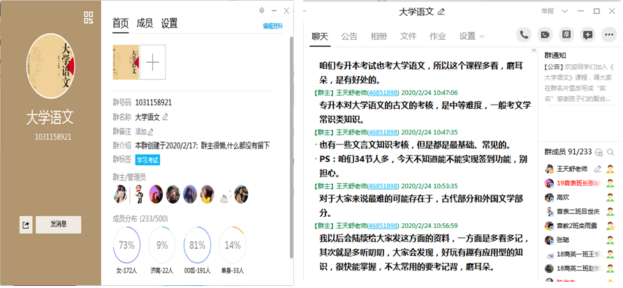 鉴于目前学生们在家学习的学习环境和学习习惯的不确定性,每周课前都会在课程QQ群给出时间和内容提示,预防时间观念不强的学生迟到或者错过上课时间。