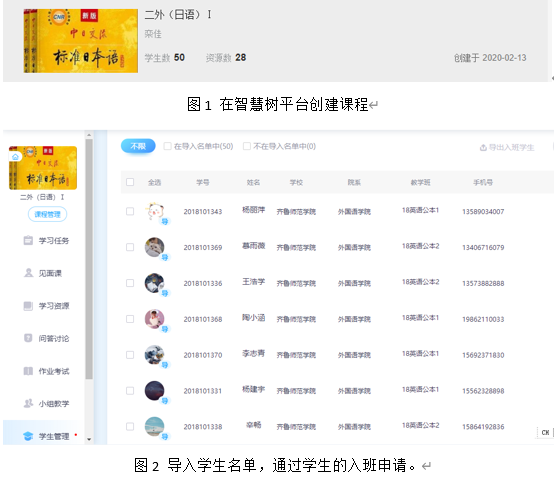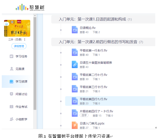 任课教师课前搜索了中国大学慕课、智慧树、爱课程、超星等多个网络教学平台,发现日语相关的课程并不多见,只有《基础日语》、《日语-自由自在日本行》、《基础日语(1)》三门课程符合零基础的日语学习者,但是这几门课程的大纲和教材与《二外日语Ⅰ》并非完全匹配,因此,任课教师决定采用翻转课堂模式,利用智慧树平台发布教学资料、布置学习任务,结合qq群课堂的直播功能进行授课。