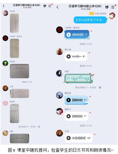 在上课的过程中,任课教师利用智慧树的见面课开展教学,提前通知学生,做好网络拥堵问题的预案。提醒学生下载腾讯会议等app,在知到出现网络拥堵问题时,及时切换至腾讯会议开展教学。课堂中利用知到的签到功能考勤,确保所有学生到位,并记录学生的考勤情况。利用知到的投票、课堂答疑、头脑风暴等方式积极与学生互动,了解并解答学生在课前学习中的疑问。另外,为了保证学生的学习质量,随时了解学生的学习状况,任课教师在每堂课都会采用随机提问的方式与学生进行互动,查看学生的假名书写情况,检查日文朗读情况。在二外日语学习的初级阶段,这种方式对于纠正学生的发音尤为重要。