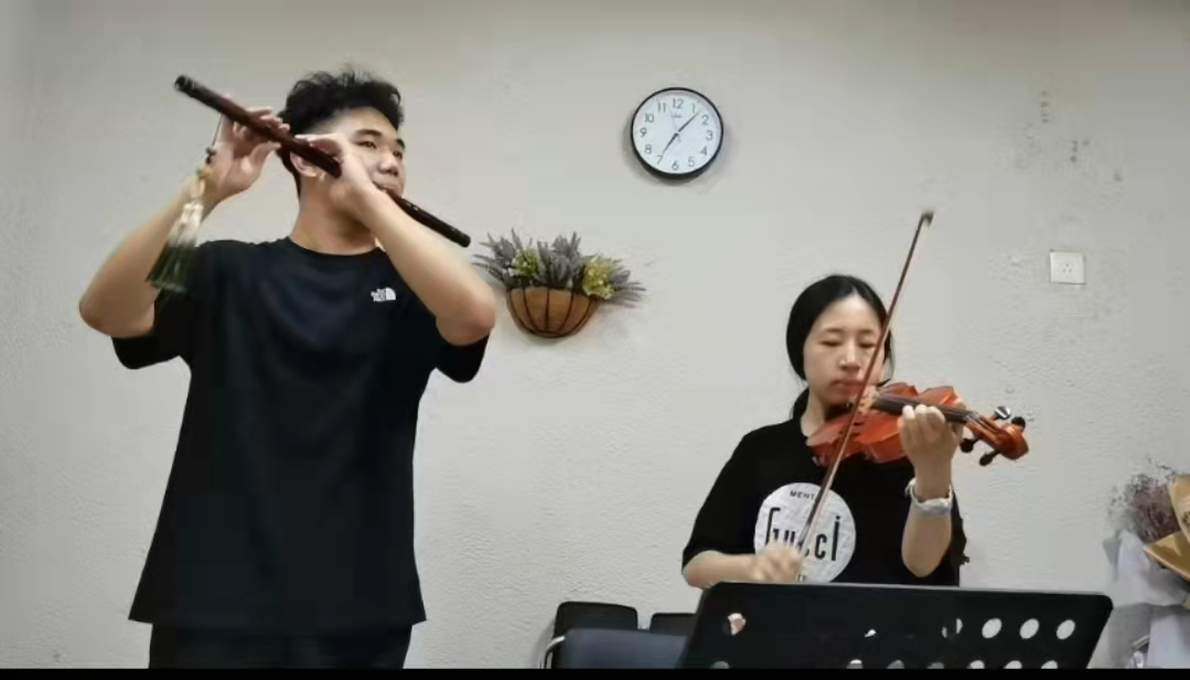 “请把我的歌带回你的家,请把你的微笑留下。”大学生志愿者王家祺、刘奕彤为小朋友们送上一首器乐二重奏《歌声与微笑》,希望小朋友们每天都能开开心心,健康快乐的成长。