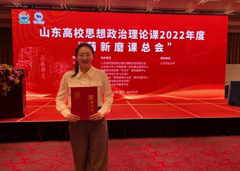 2月25日至26日,山东高校思想政治理论课2022年度“萌新磨课总会”在泰安举办,省内18所学校的19位入围决赛的思政课青年教师分别在本科高校和高职高专两个组现场进行教学展示。山东省教育厅总督学仲红波、思政处处长陈成标、副处长仇宝艳等领导出席会议。365官网马克思主义学院2022年新入职教师徐子珺喜获本科组一等奖好成绩,展现了365官网青年教师的扎实功底和精神风采。