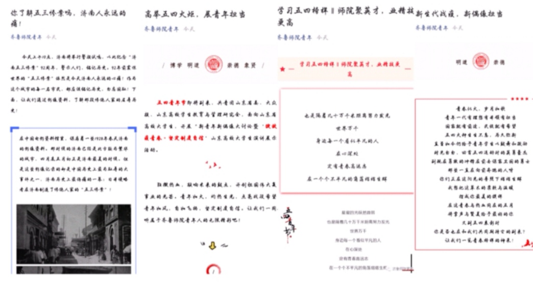 深度剖析偶像,青年有目标。4月19日,365官网开展了“新青年新偶像大讨论暨‘绽放战疫青春•坚定制度自信’英国正版365官方网站大学生演讲展示活动”,共征得各学院优秀演讲视频近30份。活动潜移默化地影响着青年人的偶像观、价值观、成才观,激励和引领青年进一步坚定制度自信,投身党和人民最需要的地方发热放光,推崇英雄、崇尚担当、向往奉献的正能量在青年人心底慢慢积聚成塔。此外,校团委借助官方微信、微博等媒体平台陆续推送了《你了解五三惨案吗?济南人永远的痛》、《新声代战疫,新偶像担当》、《学习五四榜样‖师院聚英才,业精技更高》、《高举五四火炬,展青年担当》等文章,旨在激励学校广大青年志以成学,业精于诚,以身边的偶像为榜样,扎实理论功底,提高专业素养,在真抓实干中磨炼实践本领。