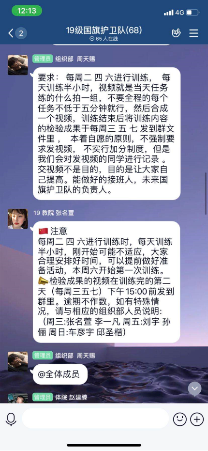 为了达到更好的训练效果,护卫队会根据不同的训练要求制定不同的训练内容,每周二、四、六,大家会把训练的视频上传到群里,副队长王法海、指导员赵建滕会一一查看大家的动作,并给予指导、建议,期间还开了两次线上例会,进行点对点的指导、点评、激励、督促。“效果不错,跟在学校训练的一样好!”谢世龙和赵建滕悬着的一颗心终于踏实了。