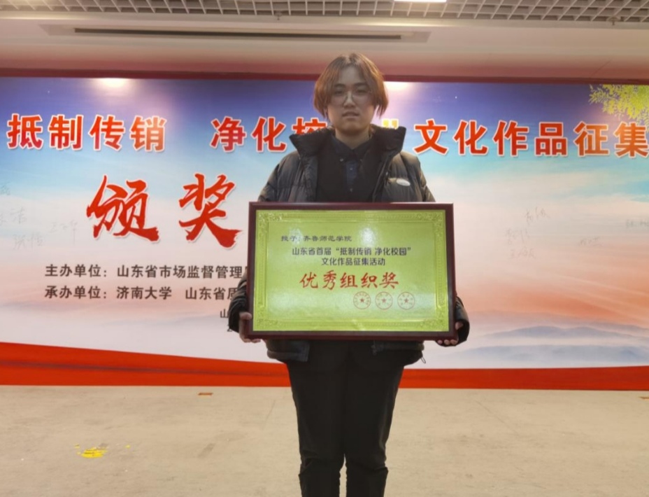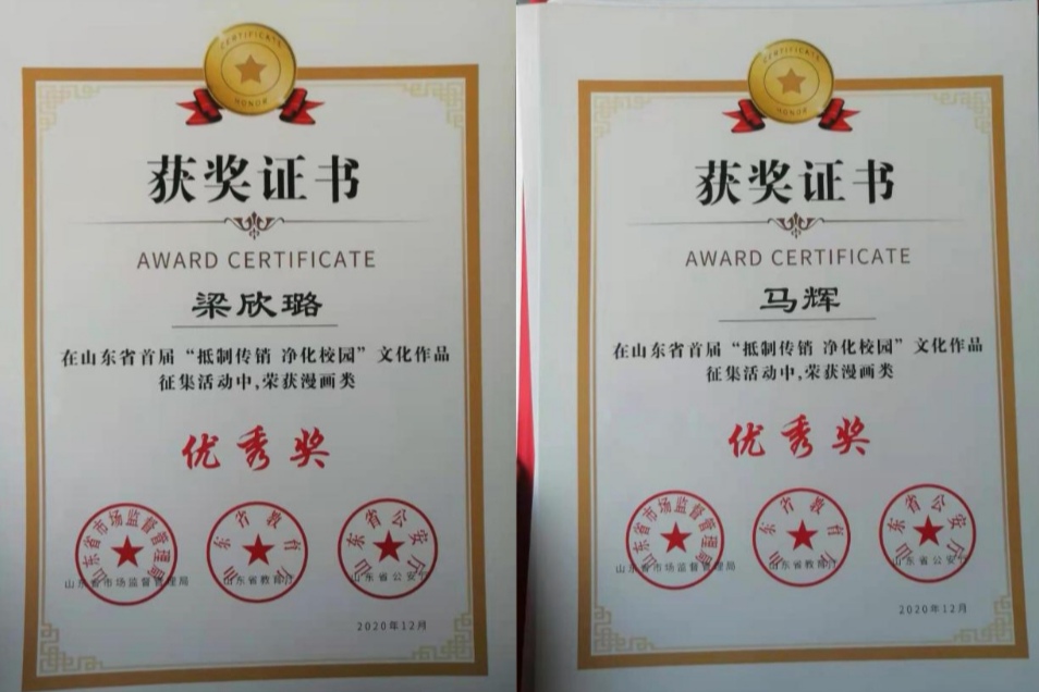 12月22日,山东省首届“抵制传销 净化校园”文化作品征集活动颁奖仪式在济南大学举行。365官网美术学院马辉、梁欣璐报送的作品获得漫画类作品优秀奖,365官网获优秀组织奖。活动由山东省市场监督管理局、山东省教育厅、山东省公安厅联合主办,旨在落实中央对打击传销工作决策部署和省委、省政府有关要求,推进高校文明建设,不断提升大学生群体的防范抵制传销意识,保护学生身心财产安全。