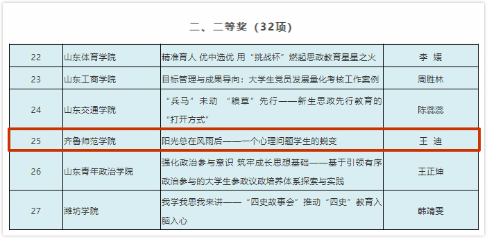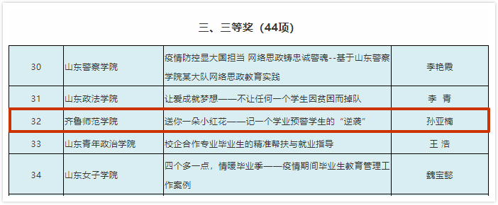 中共山东省委教育工委于2021年3月启动全省高校辅导员2020年度优秀工作案例评选活动,经过院校推荐、专家评审、网上公示,共评选出公办本科院校优秀工作案例100项,其中一等奖24项、二等奖32项、三等奖44项。