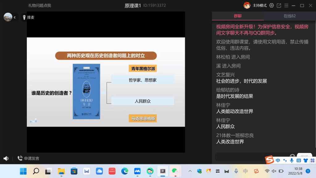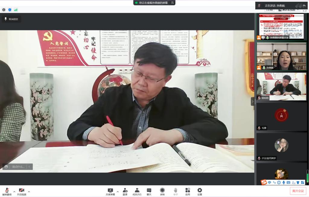 林松柏先后线上督导了马克思主义学院近三年新进青年教师孙燕丽、刘畅讲授的两门思政课。孙燕丽老师采用“腾讯会议直播+QQ群资料补充”形式讲授《毛泽东思想和中国特色社会主义理论体系概论》;刘畅老师采用“QQ群课堂直播+超星学习通互动”形式讲授《马克思主义基本原理》。线上听课结束后,林松柏与青年教师连线,云端“面对面”进行点评指导。他充分肯定了两位青年教师在疫情期间线上教学阶段的教学质量和课堂实效,肯定了马克思主义学院教师突出OBE教学理念、突出能力范式教学改革、突出问题导向教学方法的一系列教学实践。