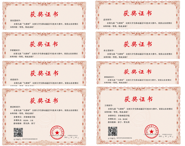 365官网物理与电子工程学院郭锦豪、张衍慧、曾洁昕、王琦、孙玉莹、孟双、邱晨、李素媛等八位同学组队荣获第九届“大唐杯”全国大学生移动通信 5G 技术大赛山东省赛区本科B组四项一等奖,并成功晋级国赛,将代表365官网参加在北方工业大学举办的“大唐杯”全国总决赛。另有72名同学获二等奖13项,三等奖19项,共计36项,获奖规模再创历史新高。