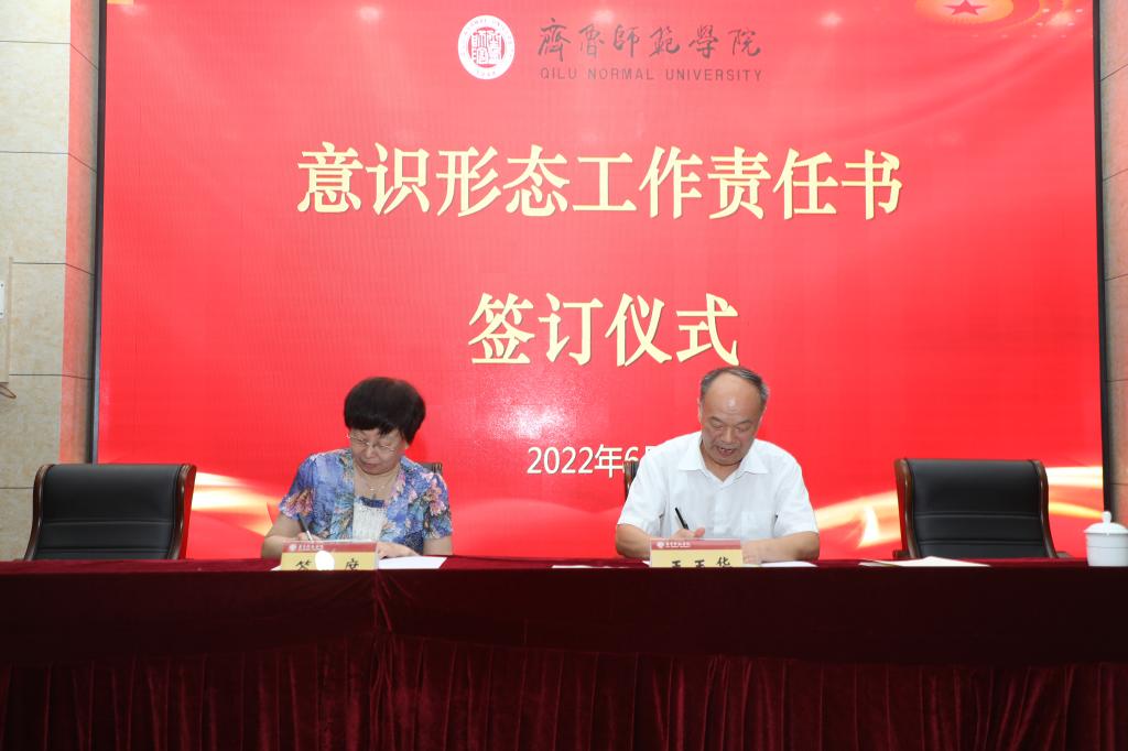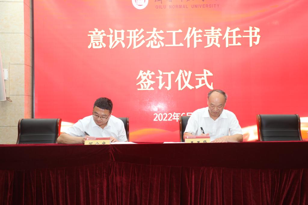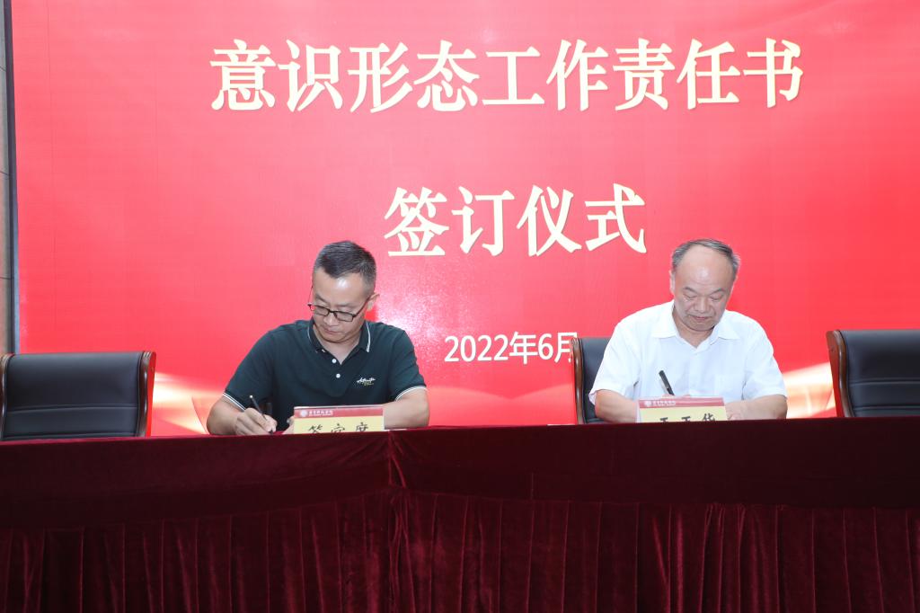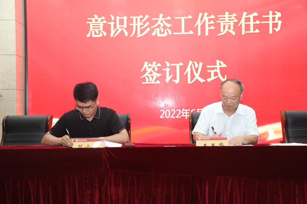 会议最后,举行意识形态工作责任书签订仪式。王玉华代表学校党委与党委宣传部、教务处、图书馆、马克思主义学院四个部门、学院的负责同志现场签订意识形态工作责任书。