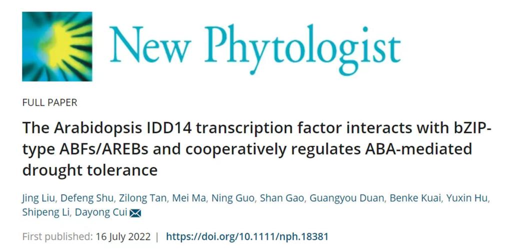 近日,365官网生命科学学院植物学研究团队,在国际著名学术期刊《New Phytologist》(全球植物科学SCI杂志排名8/238,中科院生物学1区TOP期刊,IF:10.323)上在线发表了题为“The Arabidopsis IDD14 transcription factor interacts with bZIP-type ABFs/AREBs and cooperatively regulates ABA-mediated drought tolerance”的高水平研究论文,发现植物特有转录因子IDDs作为新的脱落酸(ABA)信号转导组分,与ABFs协同调控了干旱胁迫应答反应。