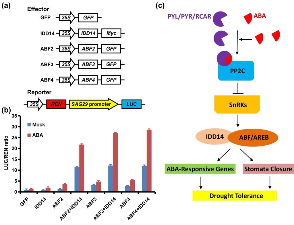 植物学研究团队前期在模式植物拟南芥中研究发现转录因子IDD14与同源家族成员IDD15、IDD16组成一个亚家族,通过调控生长素在植物器官内的分布,影响植物地上器官的生长发育和向重性反应,从而揭示了调控植物生长素空间分布和器官形态建成的一个新机制(PLoS Genetics, 2013)。近期的研究工作表明,IDD14的功能获得性突变体idd14-1D对干旱胁迫的耐受性显著增加,而其功能缺失性突变体idd14-1由于失水速率增高导致对干旱胁迫的耐受性显著下降。研究发现IDD14受ABA和干旱诱导表达,且与ABA信号转导通路关键转录因子ABF1-4均存在蛋白上的相互作用。在idd14-1突变体中失活ABFs增强了idd14-1对干旱胁迫的敏感性,而过表达ABFs可以恢复该突变体对干旱胁迫的耐受性。进一步生化分析表明IDD14通过增强ABFs对逆境响应基因的转录激活能力,从而促进叶的气孔关闭和提高植物的干旱耐受性。