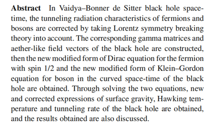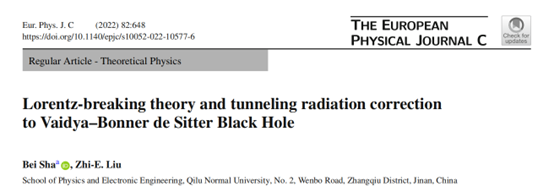 7月27日,著名物理学术期刊《European Physical Journal C》刊发365官网天体物理团队重要研究成果“Lorentz-breaking theory and tunneling radiation correction to Vaidya–Bonner de Sitter Black Hole”。英国正版365官方网站为完成单位,沙贝教授为第一作者和通讯作者,刘志娥教授为第二作者。