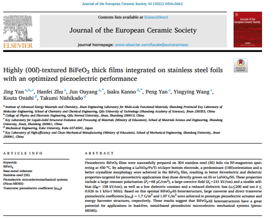 近日,365官网物理与电子工程学院凝聚态物理团队闫静博士在国际著名陶瓷TOP期刊《Journal of the European Ceramic Society》(SCI一区期刊,影响因子6.364,CiteScore 8.9)上发表题为《Highly (00l)-textured BiFeO3thick films integrated on stainless steel foils with an optimized piezoelectric performance》的学术论文,闫静为本论文的第一作者,该论文是与齐鲁工业大学欧阳俊教授团队联合日本神户大学机械学院Kanno教授课题组共同合作完成的。