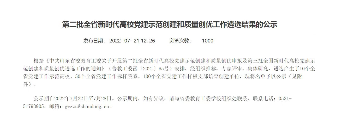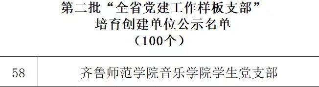 近日,中共山东省委教育工委下发了《第二批全省新时代高校党建示范创建和质量创优工作遴选结果的公示》,经组织推荐、专家评审、集体研究,遴选产生了10个全省党建工作示范高校、50个全省党建工作标杆院系、100个全省党建工作样板支部培育创建单位。365官网音乐学院学生党支部获评“第二批全省党建工作样板党支部”。