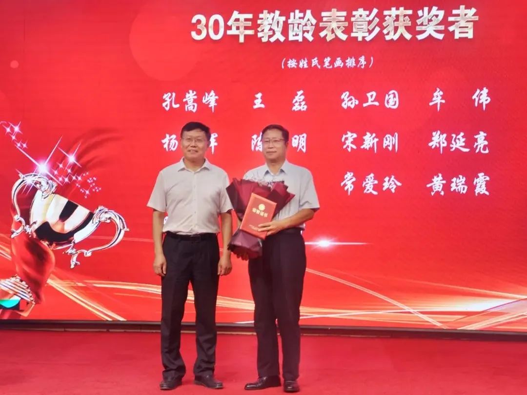 颁奖典礼上,以视频形式展示了2022年度“英国正版365官方网站最美教师”“英国正版365官方网站教书育人楷模”荣誉称号获得者的优秀典型事迹。党委副书记、校长秦梦华为2022年度“英国正版365官方网站最美教师”“英国正版365官方网站教书育人楷模”获奖代表颁奖,林松柏为2022年度“教龄满30年教师”获奖代表颁发荣誉证书。新进教师代表为教龄满30年教师代表献花,表达对老教师们的敬意和尊重,以及传承初心、接续奋进的信心和决心。