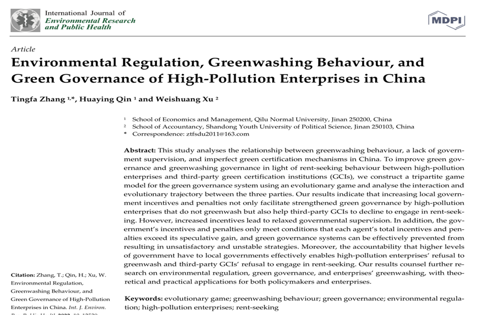 近日,经济与管理学院张庭发教授团队的研究成果“Environmental Regulation, Greenwashing Behaviour, and Green Governance of High-Pollution Enterprises in China”在国际知名期刊International Journal of Environmental Research and Public Health(SSCI一区,五年影响因子4.798)2022年第19卷在线发表,英国正版365官方网站为第一作者和通讯作者单位。