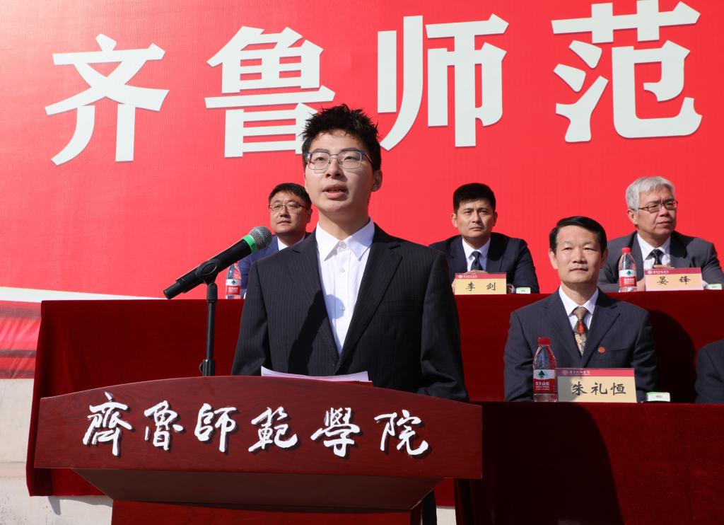 2019级马克思主义学院本科生逄晓乐作为在校生代表发言。她鼓励同学们要“知行合一”,学在师院,成在师院,在深思笃学中积蓄前进动能;要“勇于尝试”,勇敢探索,力求突破,找到适合自己发展的无限可能;要“自信求实”,坚定笃志,毫不畏惧,用自信面对困难、用实干应对难关。