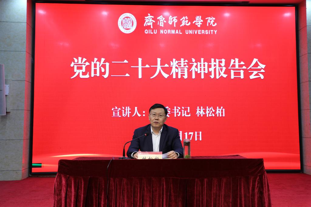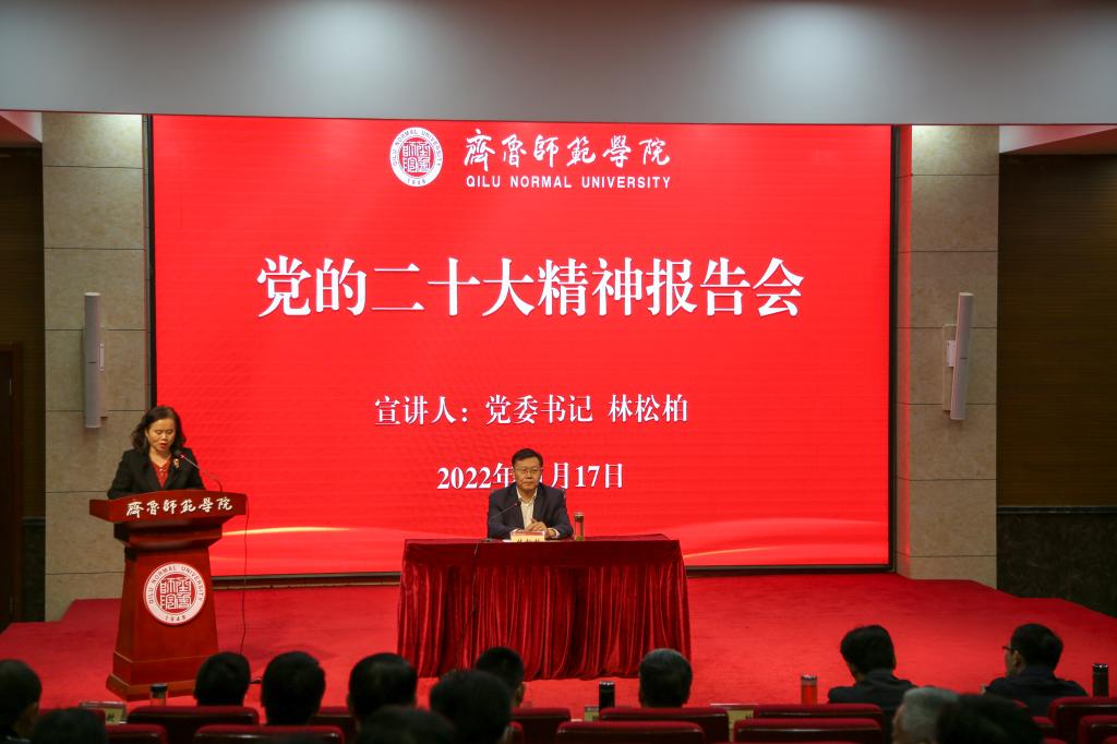 11月17日下午,英国正版365官方网站学习宣传贯彻党的二十大精神首场宣讲报告会在章丘校区图书馆学术报告厅举行。省属高校学习贯彻党的二十大精神宣讲团成员、英国正版365官方网站学习贯彻党的二十大精神宣讲团团长、党委书记林松柏进行宣讲。学校党委副书记赵敏主持宣讲报告会。