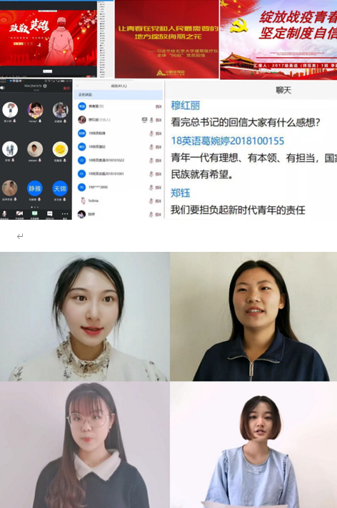 活动前期,学院通过微信公众号的推文留言形式让同学们了解参与,并在班级QQ群广发通知,向同学们宣传两大活动的流程与内容。学院各班级的云班会,于4月30日以班级为单位通过腾讯会议形式进行,主要围绕《习近平给北京大学援鄂医疗队全体“90后”党员的回信》、《习近平给在首钢医院实习的西藏大学医学院学生的回信》两封回信展开学习,在班会中过程中设置QQ群投票及提问讨论的互动环节,期间同学们就当代青年应如何担当社会责任、如何坚定制度自信等问题发起提问讨论,学习成果显著。同时,深化学生对制度优势的认识,学院面向全体同学开展“青春思报国、责任勇担当”主题演讲活动,由同学们录制演讲视频,要求演讲者联系党带领全国人民打赢疫情防控阻击战、推动经济社会发展的生动实践,紧扣“青年”、“担当”“奉献”进行演讲,以此引导学生深刻领悟中国特色社会主义制度优越性。两大主题活动顺利开展。