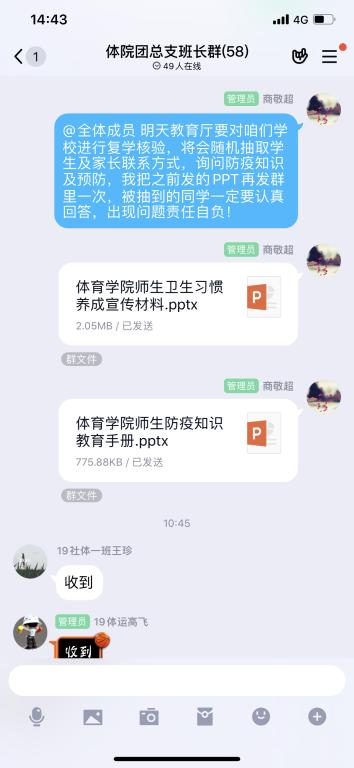 组织全体师生观看国家广播电视总局播出的《2020开学第一课》并要求每名同学认真观看,总结观后感。为了推动学习,体育学院专门整理了一套疫情防控应知应会题库,通过工作群、微信公众号等平台发送,对师生加强全覆盖宣传教育。