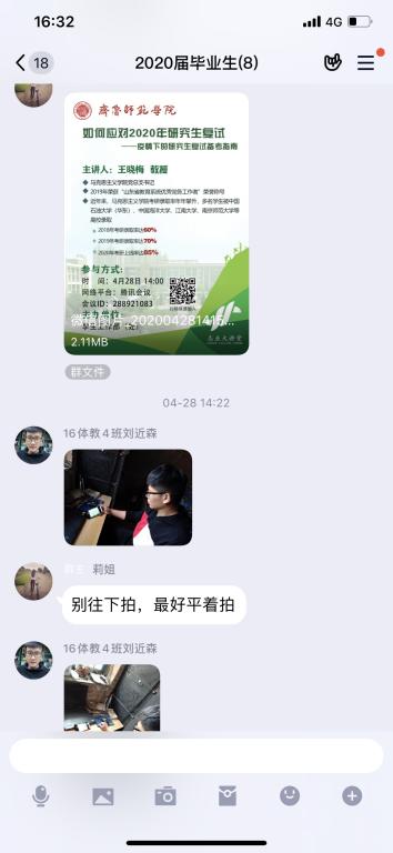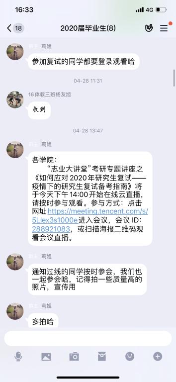 针对参加研究生复试有关同学,组织同学们进入连线会议,观看学生处校友办举行的《针对考研复试的经验分享直播》,针对家庭经济困难的学生积极开展观看《如何应对2020年研究生复试—疫情下的研究生复试备考指南》。体育学院发动校友网,积极了解有关学校研究生复试信息,一对一辅导学生有关复试问题,争取让每考研学生成功上岸。