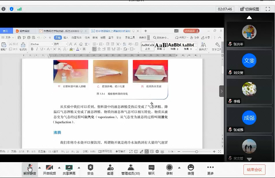 重点展开了随机题目模拟授课的备赛策略,简要介绍了物理教学概念教学、物理规律教学、物理实验教学以及物理问题解决教学的特点和具体实施策略。并结合初中物理、高中物理模拟上课案例展开线上讨论和指导。本次报告李教授语言朴实而不失幽默,案例讲授环节既考虑引领师生思考讨论又通过详细解读使之具体又生动,与会师生反响热烈。