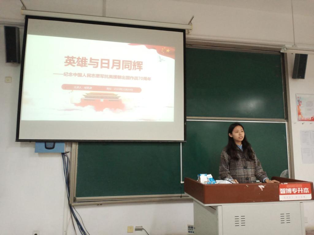 为纪念中国人民志愿军抗美援朝出国作战70周年,2020年10月29日至31日,化学与化工学院2019级各团支部陆续开展了主题为“英雄与日月同辉”的政治学习活动。各班团支书为主讲人,带领同学们重温中国人民志愿军建立的不朽历史功勋,致敬谱写了气壮山河英雄赞歌、创造了人类战争史上以弱胜强光辉典范的志愿军将士,学习和弘扬伟大的抗美援朝精神。本次活动通过“新视界”、“习语录”、“学榜样”、“心互动”四个环节展开。