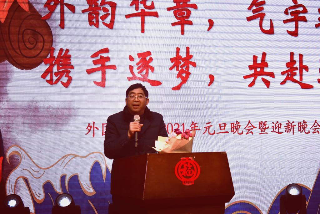 12月16日晚6:00,外国语学院在图书馆学术报告厅举办“外韵华章,气宇飞扬,携手逐梦,共赴远方”主题元旦晚会。学院党总支副书记郁志营、团总支书记牛荦、团总支副书记孙海燕、2019级辅导员倪冉、2020级辅导员王伟、部分教师代表以及2020级全体学生参加了此次晚会。