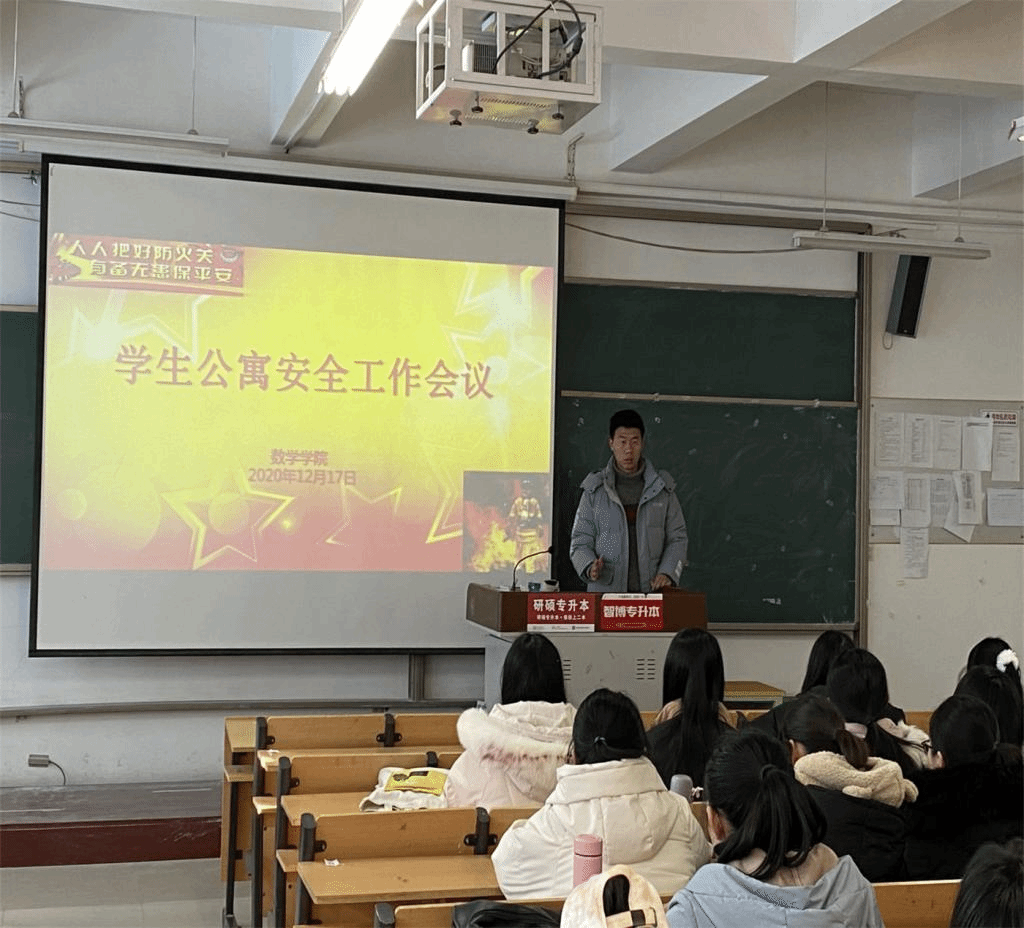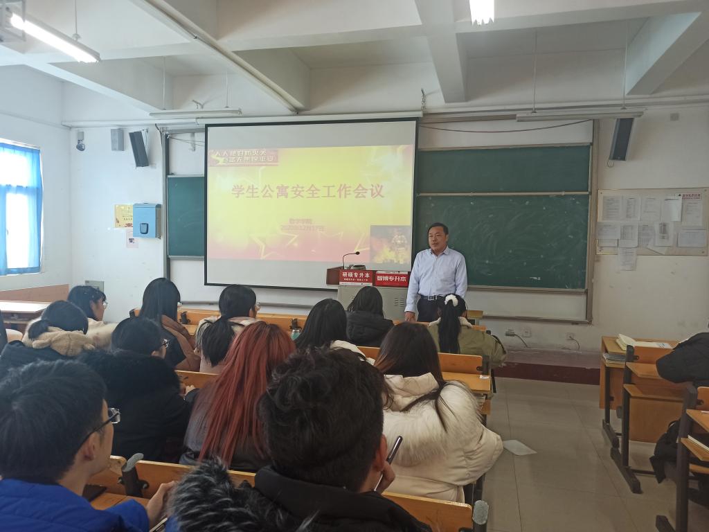 为提高同学们的安全意识,构建平安和谐校园,12月18日下午,数学学院在二号教学楼A407教室召开了学生公寓安全工作会议,学院党总支书记孔志学参加会议并讲话,学院团总支副书记孟凡湘以及学院各班班委、宿舍舍长参加会议。