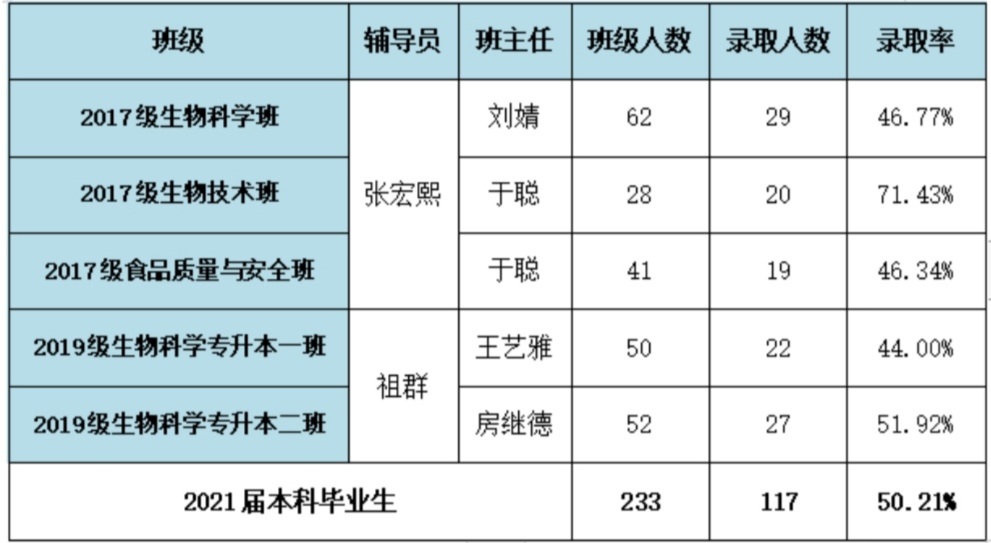 2021年全国硕士研究生录取工作已经圆满结束,生命科学学院2021届毕业生考研工作取得骄人成绩,考研录取率再创新高。经统计,2021届233名本科毕业生中共有200人报考硕士研究生入学考试,131人初试成绩达到国家线,117人被成功录取,其中1人考取中科院,另有30人被双一流高校录取。报考率达到85.84%,上线率达到56.22%,录取率达到50.21%,创生命科学学院历史新高。此外还涌现出了一批考研典型集体,本科毕业生党员共34人,22人被成功录取,录取率达到64.71%,其中双一流高校录取率41.18%;毕业生学生干部共80人,46人被成功录取,录取率达到57.50%;2017级生物技术专业1个女生宿舍6人全部考研上岸,其中3人被双一流高校录取;2017级生物技术专业录取率高达71.43%,其中双一流高校录取率50%。