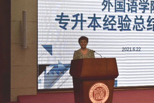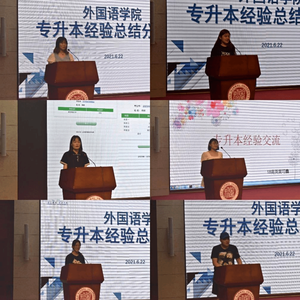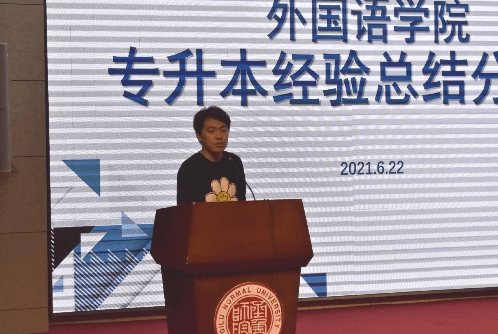 6月22日晚,外国语学院于学术报告厅召开2021届专升本经验总结分享会,外国语学院院长宋秀葵,党总支书记贾国斌,党总支副书记郁志营,团总支、商务英语教研室全体教师及2019、2020级班主任出席本次会议。此次会议由团总支书记牛荦主持,2018级商务英语专升本成功学生代表、2019级2020级商务英语(专科)专业全体学生参加会议。