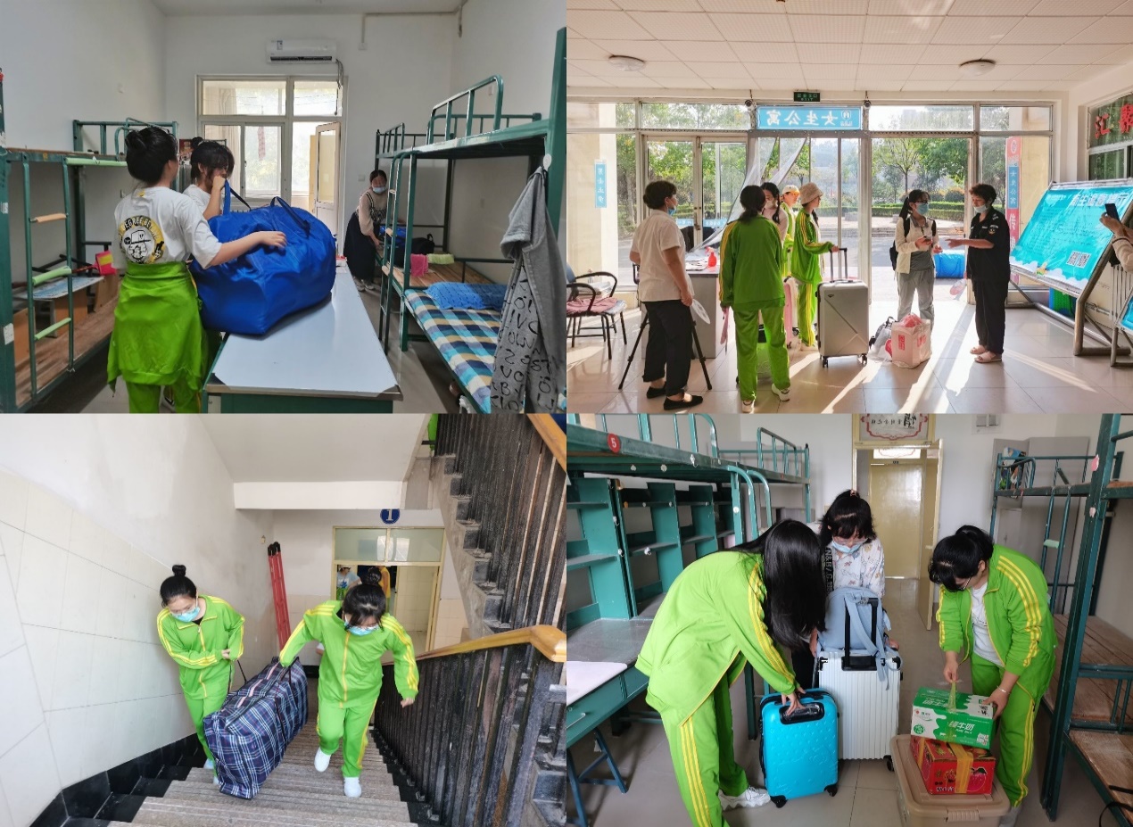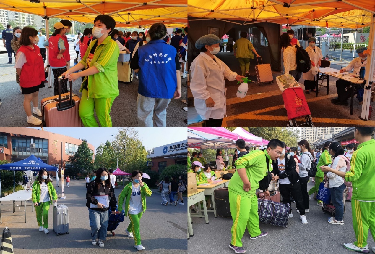 9月12日上午6:00,大巴的轰鸣声响起,接站的志愿者自师院出发,前往火车站等交通枢纽点迎接新生。志愿者们身穿印有“齐鲁师范青年志愿者”字样的红色马甲,将各院新生从接待点再引导至各院新生报到处,为新生报到工作有序开展起到了关键作用。6:40,身穿绿色院服的志愿者们集合投入到志愿服务行列,生命科学学院2020级全体学生集体行动,为2021级新生的报到工作保驾护航。为方便报到工作进行,志愿者与新生形成“多对一”的形式实施。7:00,2021级新生携录取通知书入校,在迎新小组的带领下,有条不紊地完成测量体温、人脸识别、出示行程码等流程,保障顺利完成返校报到备案。“嘀嗒、嘀嗒”是志愿者的汗水在烈日下奔跑,落到地面。一箱箱行李接续被运送到报到处,一个个新生被带到生科院。再到后续签到、填表、发放服务手册、领取卧具等流程,一传一递间为萌新印上了生科院的“印记”,一言一语里充满了对“家人”的关怀。2021级食品检验与检测技术一班的一名同学,在假期期间因意外腿部受伤,在2020级志愿者胡一寒的搀扶和老师的帮助下完成入学报到并顺利入住宿舍,这感人的一幕被相机记录,也记录着生科院师生间满满的情意。