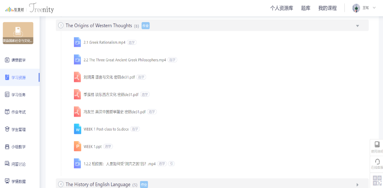 以第一周第一章为例,学习资源包括课程视频,拓展阅读电子书,教学课件,以及作为补充的国家金课引用资源等: