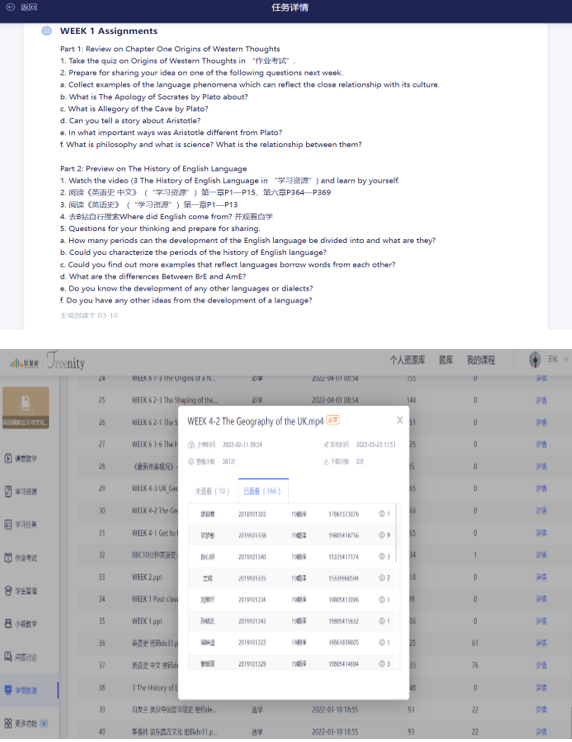 1.每周下发任务单,任务单中观看教学视频等学习过程会被记录,智慧树平台提供每个学生的学情数据,作为过程性评价的参考。
