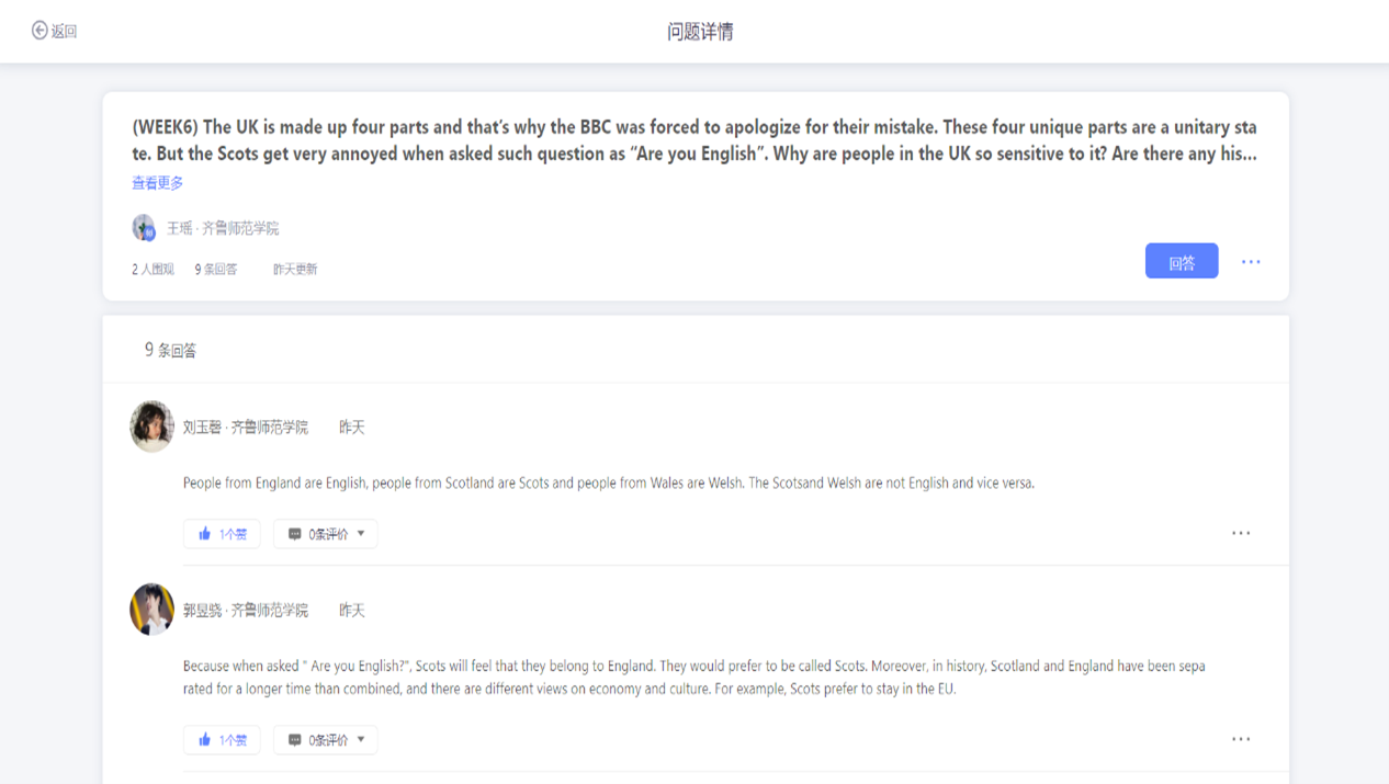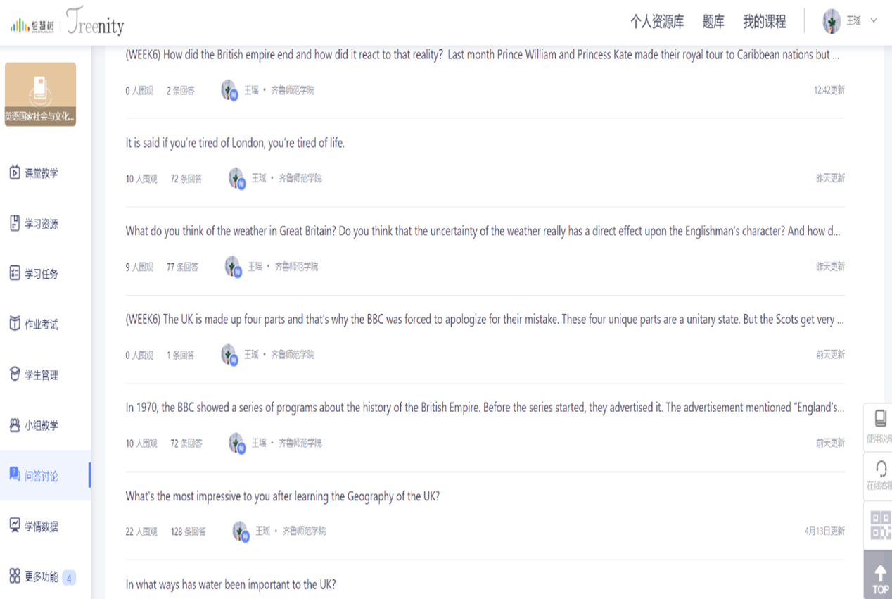 1.任务单中的思考问题也会放在“问答讨论”里,这些问题都是开放型问题,目的是促进学生查找资料,广泛阅读,积极思考,慎重表达。要求学生每周选择若干问题中的至少一个进行回答,作为过程性评价的补充。