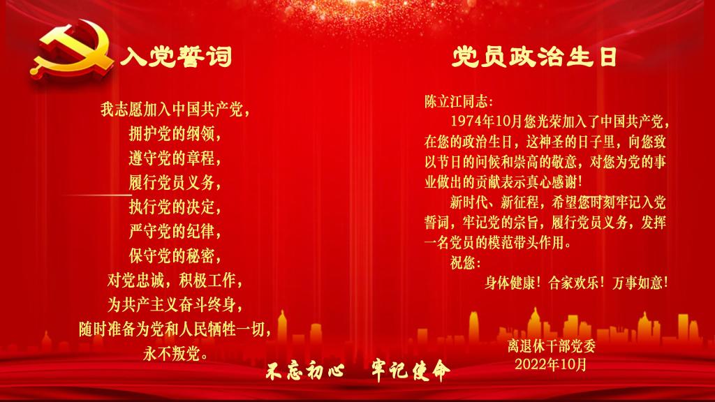 为进一步强化离退休党员政治热情,充分发挥党员先锋模范作用,近期,离退休干部党委组织为离退休老党员开展过“政治生日”活动。本次离退休党员“政治生日”以开展“四个一”活动为主要内容:一是赠送一张“政治生日”电子贺卡、二是重温一次入党誓词、三是开展一次向党说句心里话、四是结合自身实际,力所能及自愿做一次公益活动。
