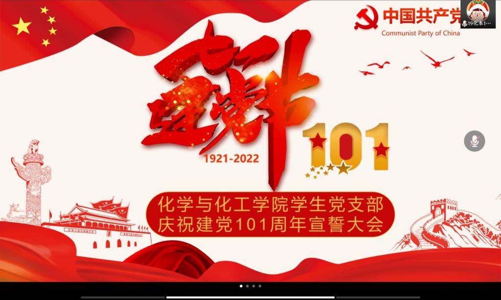 为庆祝建党101周年,激励学生党员坚定理想信念、牢记初心使命,增强全体党员学生的党性意识和宗旨意识,7月1日上午10点,化学与化工学院学生党支部举办庆祝建党101周年宣誓大会。会议以线上形式开展,由化学与化工学院学生党支部书记李钰茜主持。