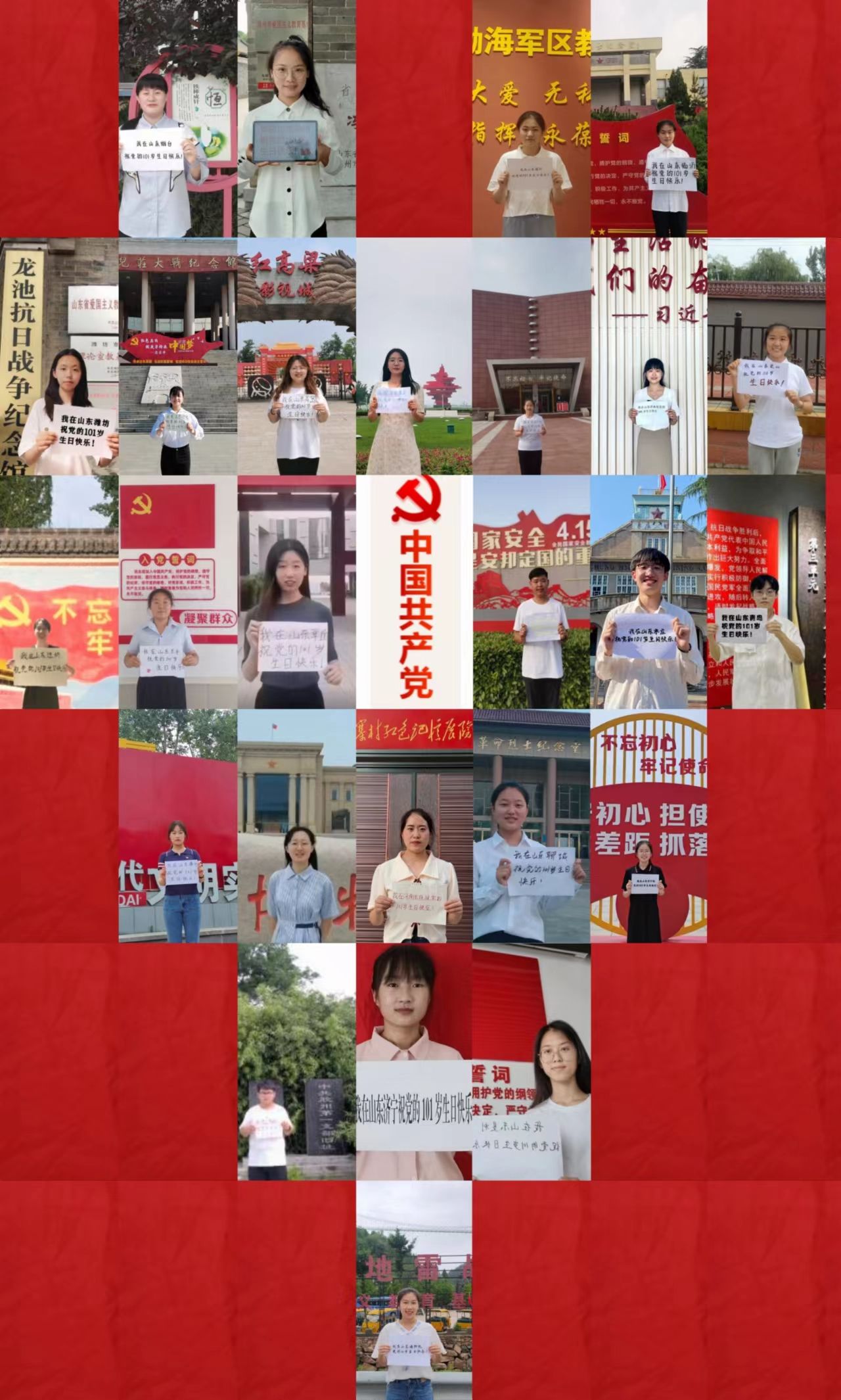 化学与化工学院积极响应习近平总书记“把红色资源利用好、把红色传统发扬好、把红色基因传承好”的指示精神,结合党史学习教育,学院26名学生党员分别去往山东省济南市、青岛市、烟台市等12地市以及河南省长垣市的标志性党建文化广场、革命先烈纪念馆、爱国主义教育基地等红色文化地标进行参观游览并拍照打卡,以身临其境、耳濡目染的方式提高“以史为镜映忠诚,以史鉴今葆初心”的党性修养,在齐鲁大地共同庆祝中国共产党的101岁生日。