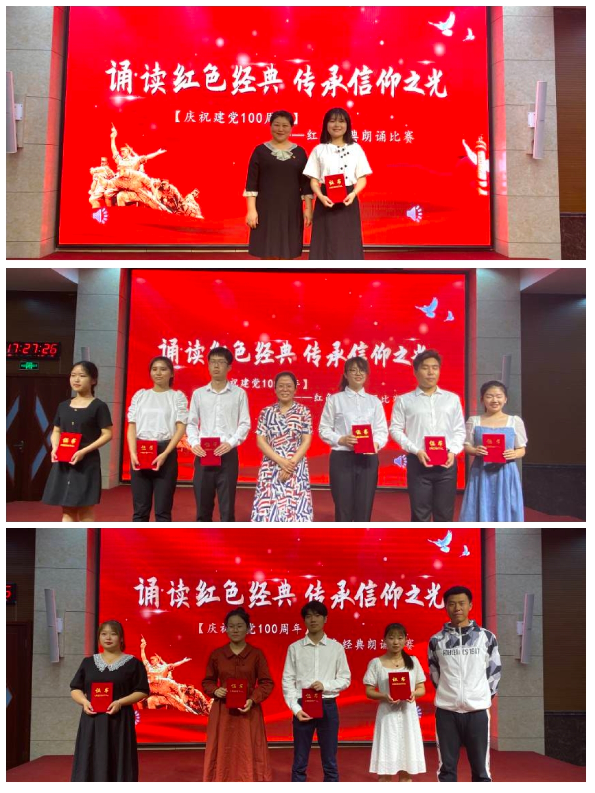 比赛中,选手们声情并茂、激情满怀,用深情的话语倾诉着对中国共产党的忠诚与热爱、对民族英雄的崇敬与感激、对祖国繁荣昌盛的幸福与自豪,生动再现了中国共产党波澜壮阔的百年征程和历久弥坚的百年初心,让同学们更深切地感受到没有中国共产党,就没有新中国,就没有中华民族的伟大复兴。